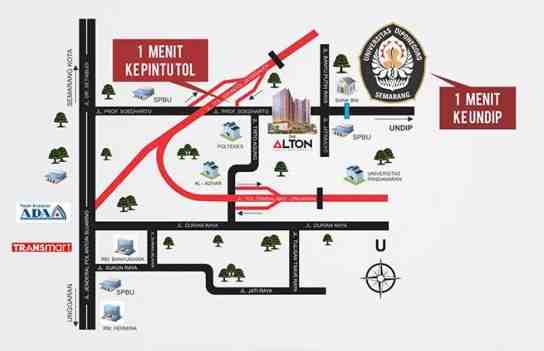 Alamat The Alton Apartment berada di Jalan Prof. Sudarto No.10, Pedalangan, Kecamatan Banyumanik, Kota Semarang. Lokasinya amat strategis untuk apartemen mahasiswa, di dekat gerbang masuk UNDIP. Selain itu, masih banyak sekolah tinggi lainnya dalam radius yang dekat. Ditambah, banyak fasilitas lain yang tersedia di sekelilingnya, seperti jalan tol, pusat belanja, dan rumah sakit. Lokasi Tembalang yang masuk wilayah Semarang atas memang memiliki pertumbuhan yang pesat. Berikut ini daftar fasilitas dan tempat penting di dekat apartemen ini: